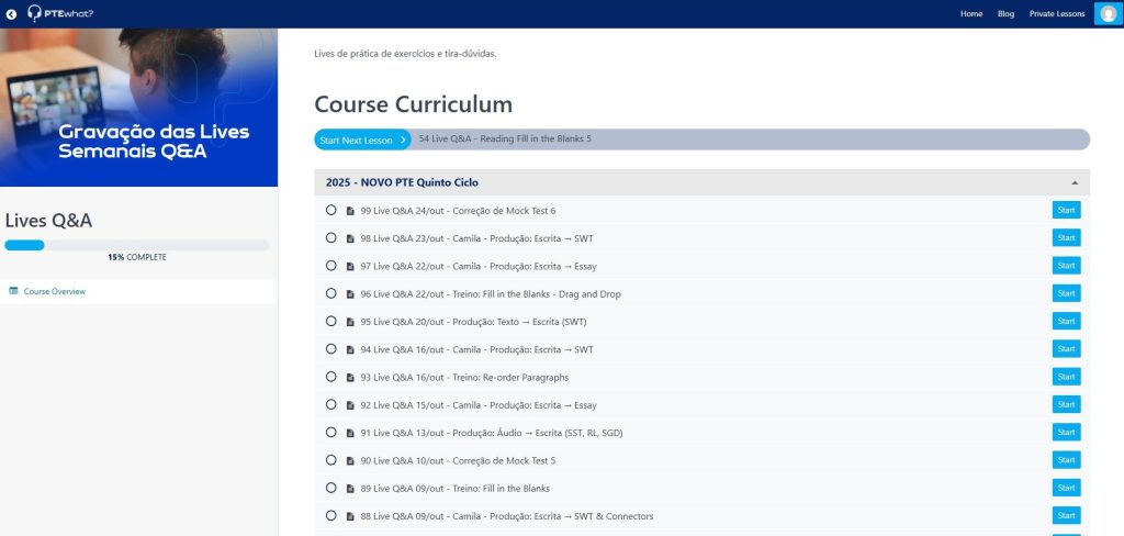 Além da grade obrigatória do curso, focada em aprender a fazer a prova, você também terá acesso a recursos extras para revisar, aperfeiçoar ou até construir do zero sua base de gramática, pronúncia e escrita. Tudo pensado para acelerar a conquista do seu objetivo no PTE.